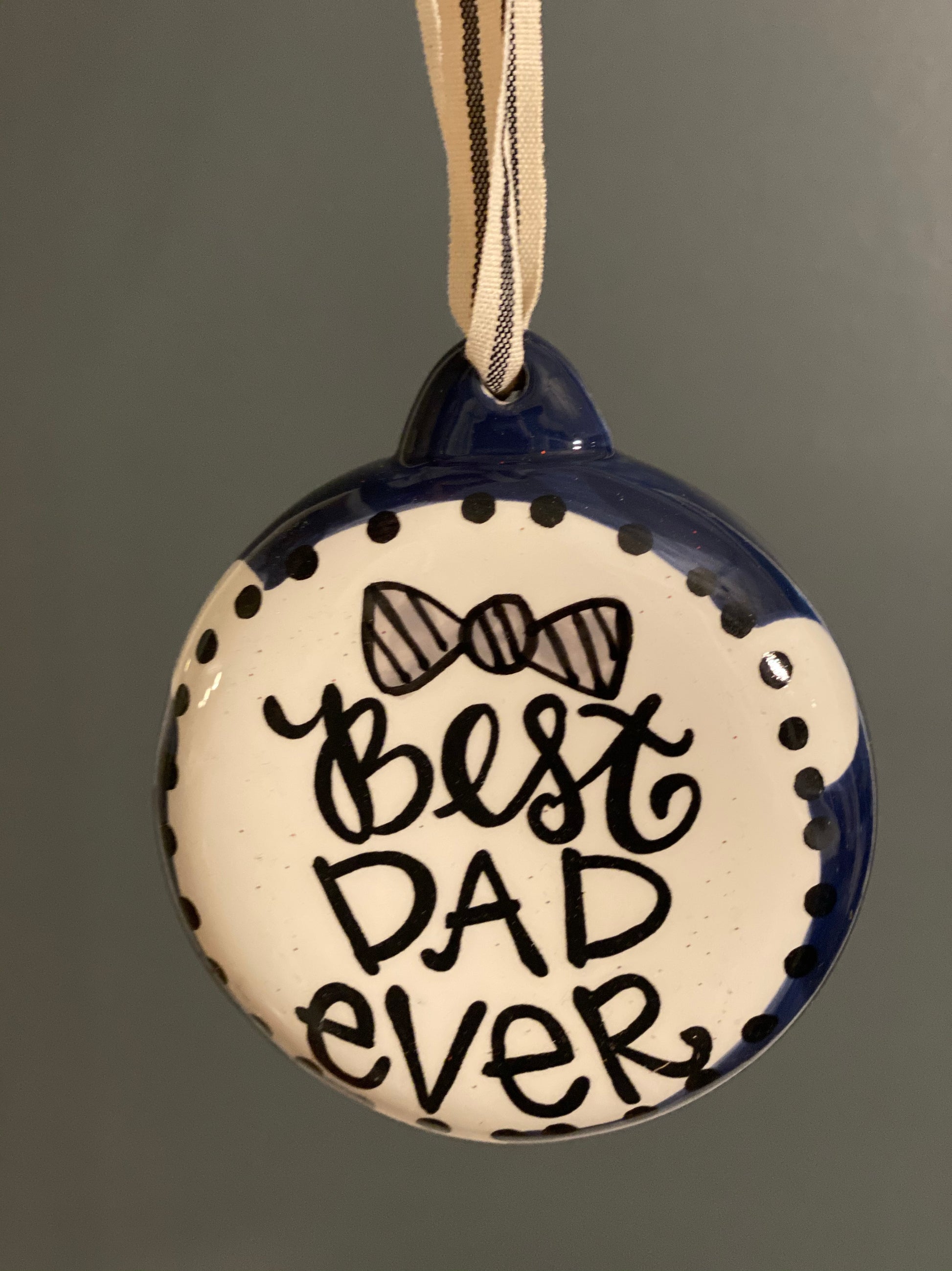 The front of this ornament reads "best dad ever". We can personalize the back with his name and the year!