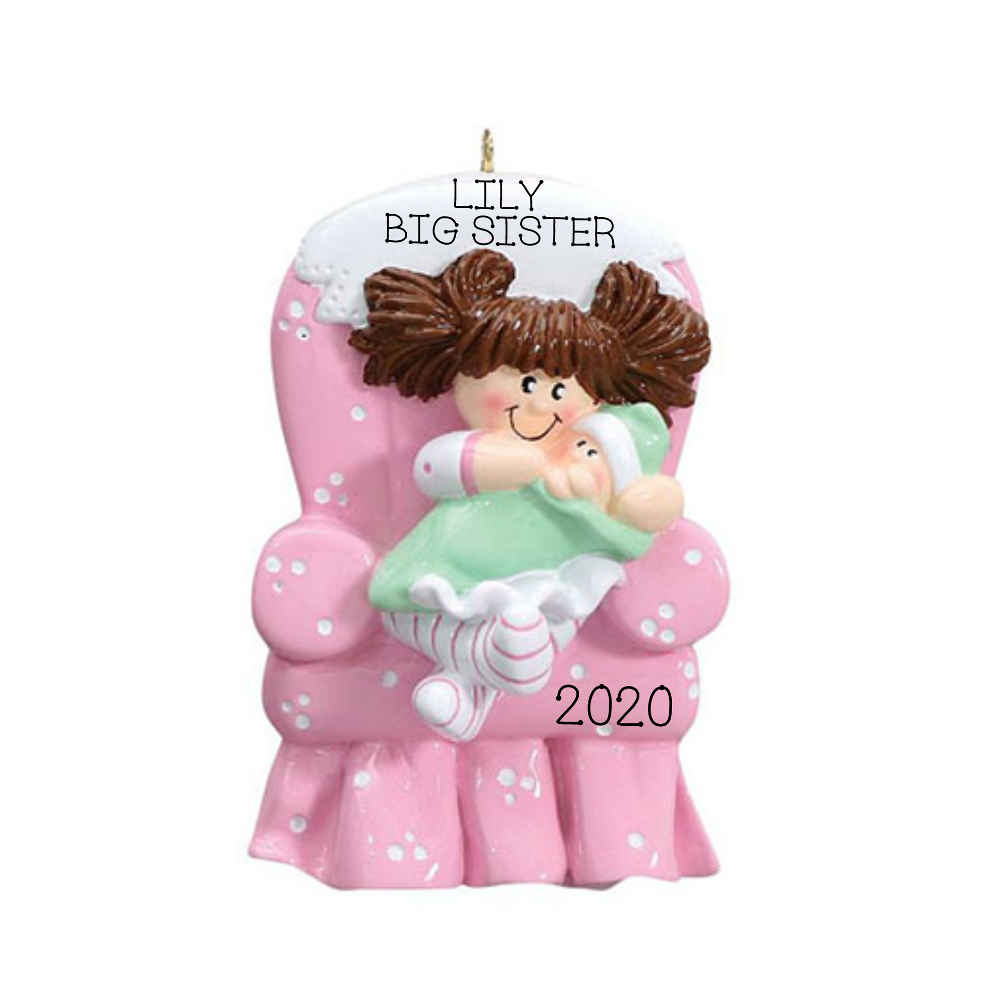 A unique ornament for the newest addition to the Big Sister club. Share your personalization for the top and the desired year for this special ornament.