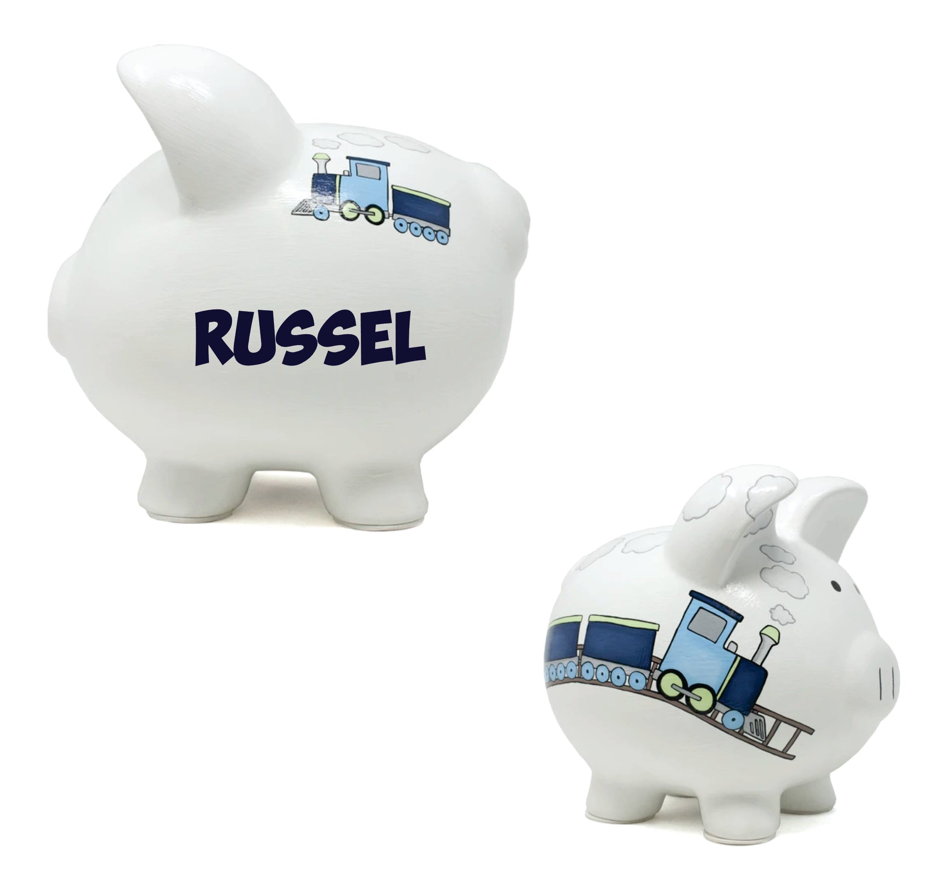 Personalized Boxcar Piggy Bank: A thoughtful, lasting gift for new or expecting parents. Made of durable ceramic dolomite with a hand-painted design, measuring 8 x 7 inches. Customize with a variety of fonts and colors.