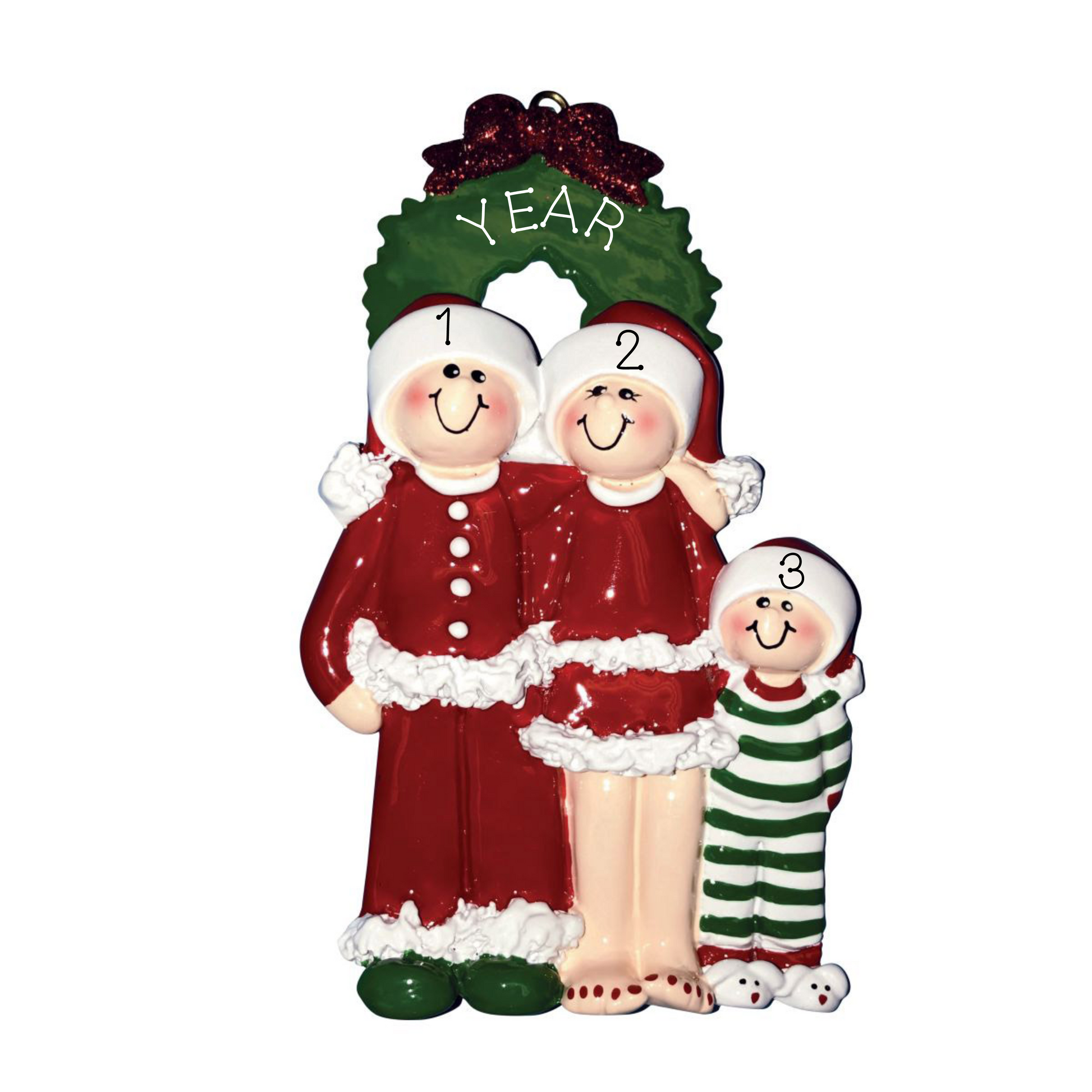 Get into the festive spirit with this snug family of 3! Only a few left! Personalize by adding their names to the hats and a year or last name on the wreath.
