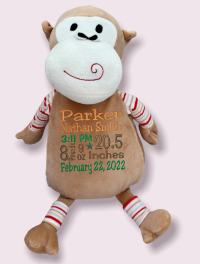 A great personalized gift for a new baby. This monkey measures 12", is super soft, and has a stuffing pillow that is removable for easy cleaning. Provide us personalization information below.
