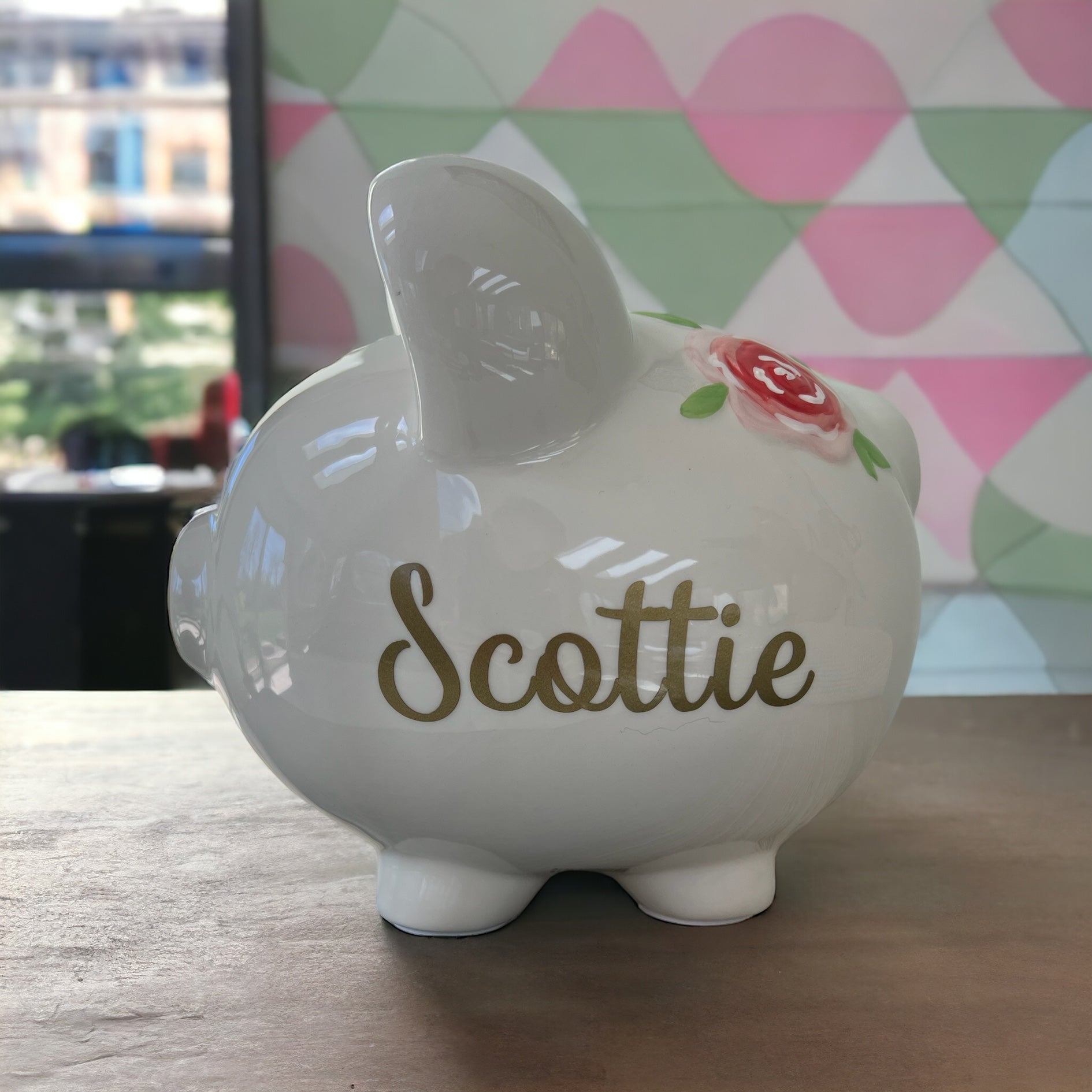 Personalized Gypsy Rose Piggy Bank: A thoughtful, lasting gift for new or expecting parents. Made of durable ceramic dolomite with a hand-painted design, measuring 8 x 7 inches. Customize with a variety of fonts and colors.