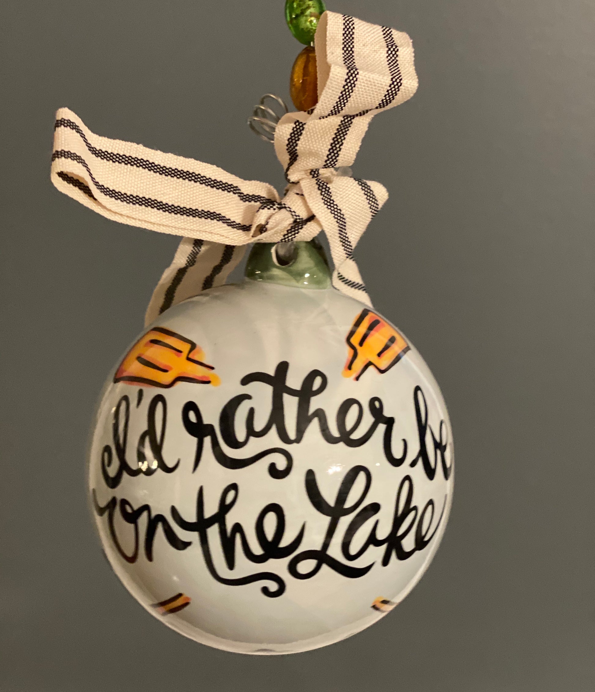 The front of this ornament includes the words "I'd rather be at the lake" We can personalize the back with the message of your choice.