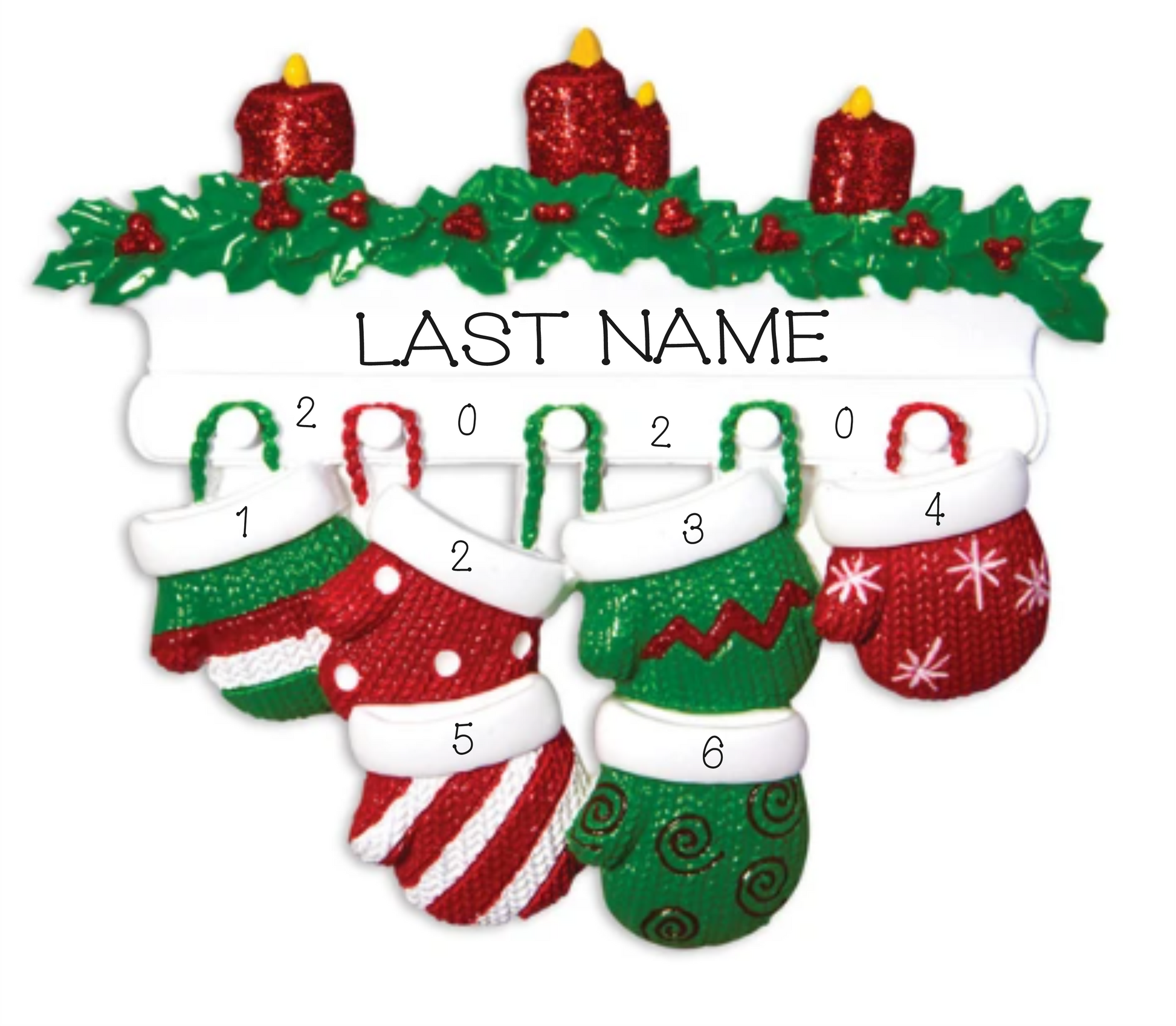 One of our BEST selling personalized ornaments! Personalize the mittens with names and the mantle can be personalized with the year and last name (or a message). A perfect ornament for a family of 6.
