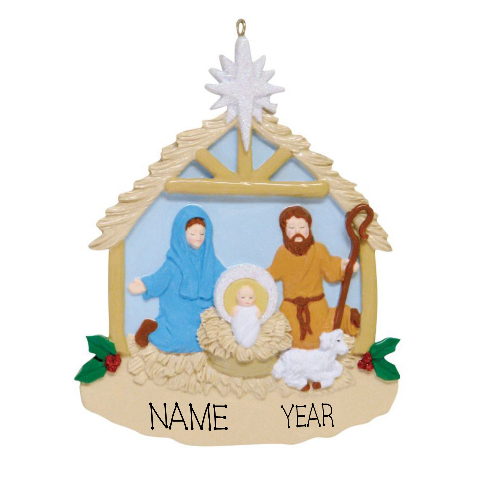 A memorable nativity ornament for your tree. Personalize with the name and year (or a short message, if desired).