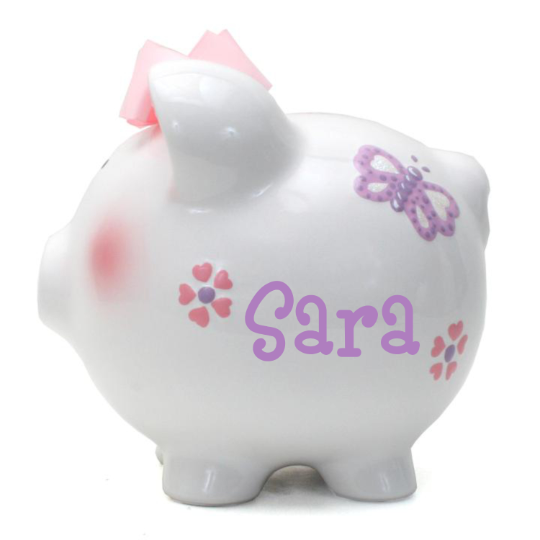 Personalized Butterfly Piggy Bank: A thoughtful, lasting gift for new or expecting parents. Made of durable ceramic dolomite with a hand-painted design, measuring 8 x 7 inches. Customize with a variety of fonts and colors.