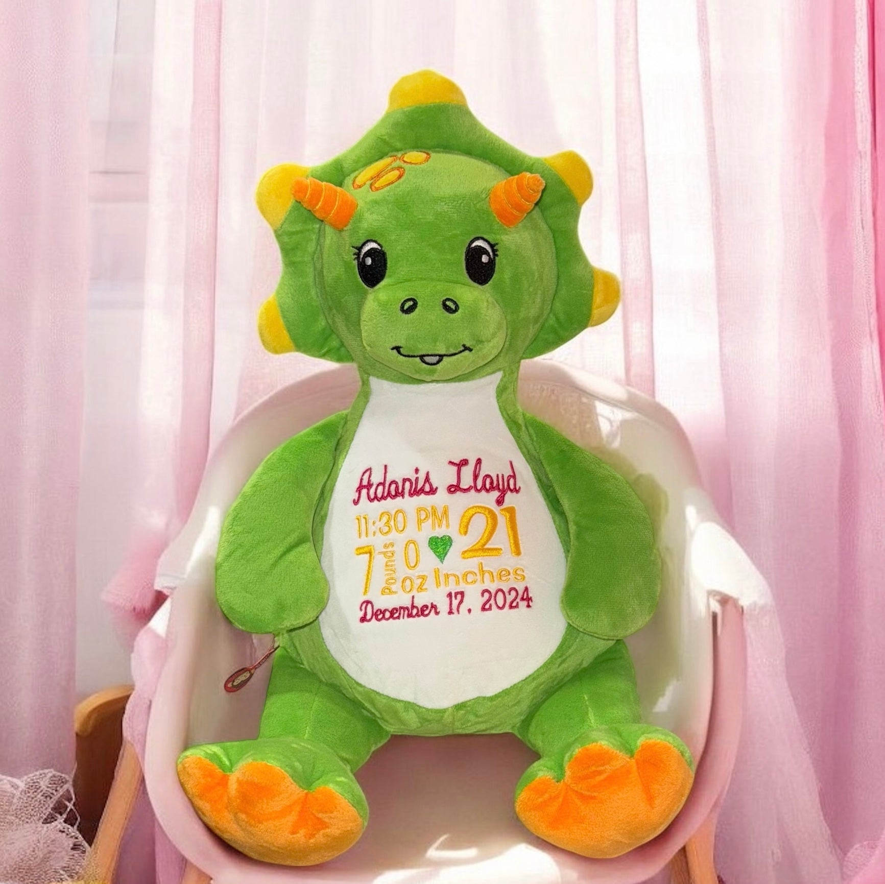 This adorable, cuddly, personalized, dinosaur stuffed animal, a top choice for baby presents! At 16" in size, it's ultra-soft, and the detachable stuffing cushion makes cleaning a breeze. A fantastic gift for any baby, whether they're a boy, girl, or a new big brother or sister! Personalized with name and birth stats.