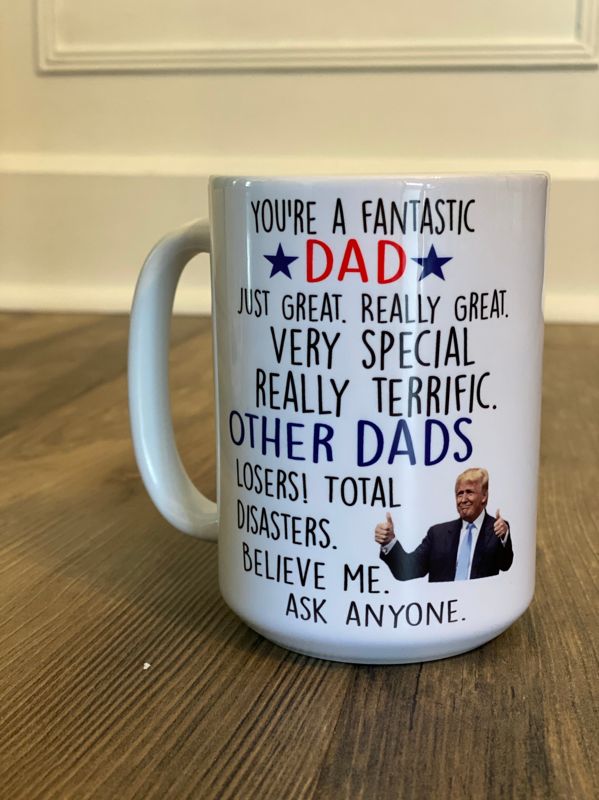 Looking for a fun y gift for dad? This fun Trump-themed mug is sure to put a smile on Dad's face! We can change the wording to Father, Dada, Papa or any other saying you'd like! Just let us know your personalization info in the comments section.
