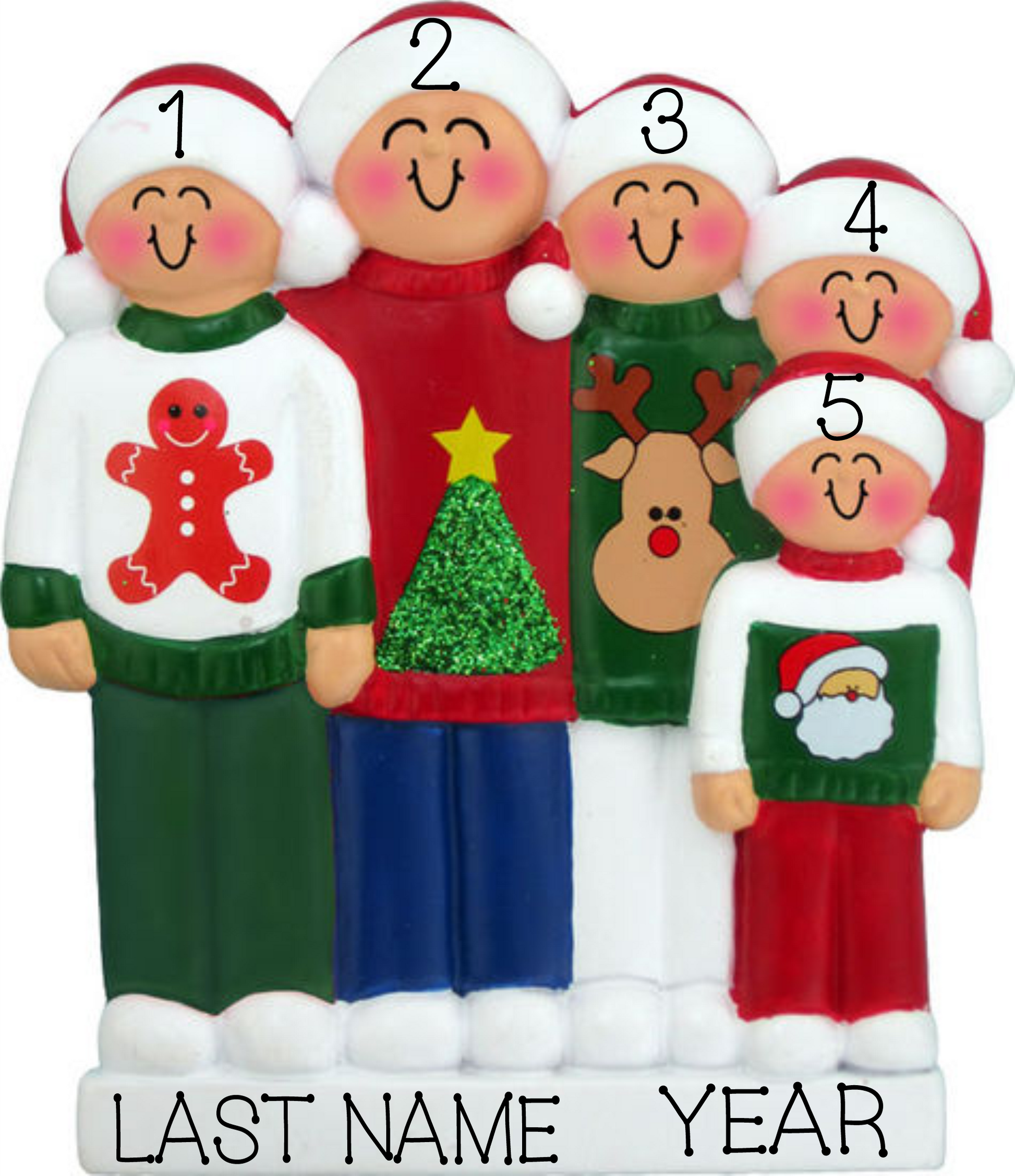 Get ready for the holidays with this family of 5 in their festive yet quirky ugly sweaters! Add a personal touch by customizing the hats with their names and the bottom with the family's last name and year. (They may not be fashionable, but they're definitely cute!)