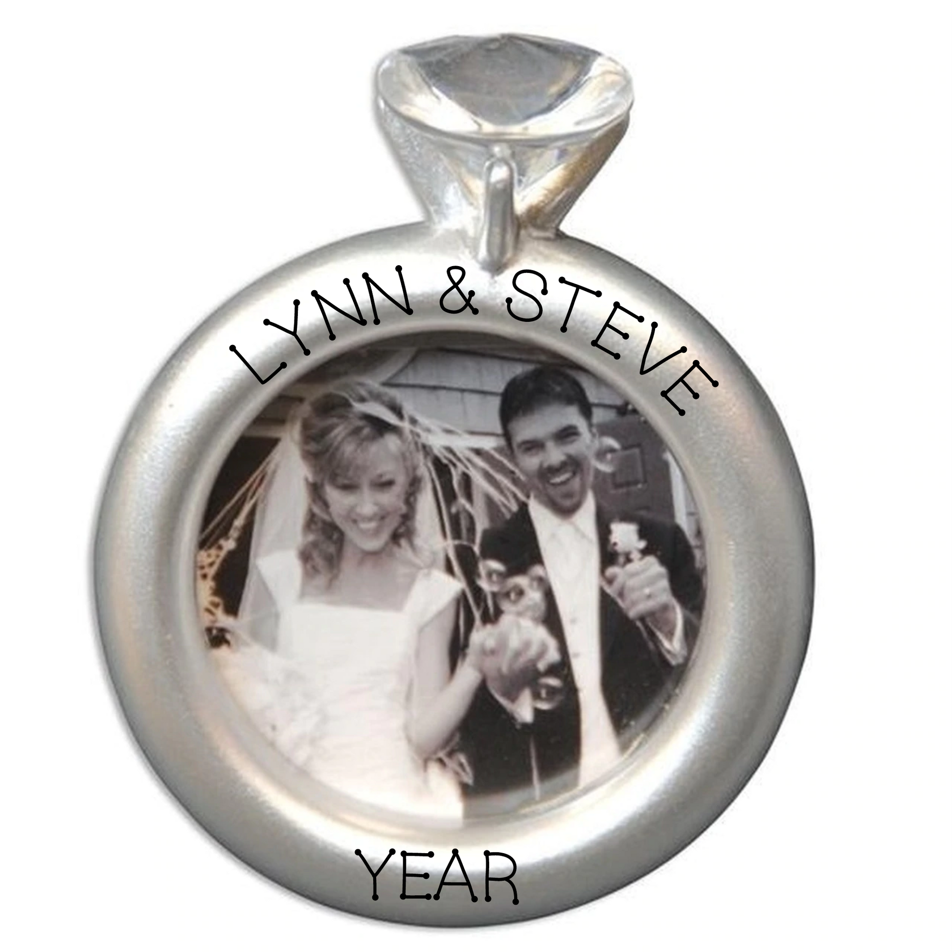 This adorable wedding ring frame ornament will make a memorable ornament on the tree this year! The frame has a easel back so it can be displayed year round! Personalize with the couple's names and wedding year.