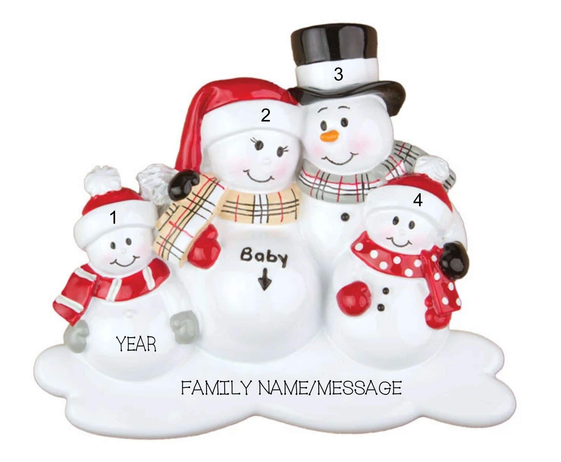 Celebrate the arrival of a growing family with this personalized ornament! Four charming snowmen (one with a cute baby bump) are waiting to be customized with names on their hats and a family name/message on the bottom. And don't forget to add the year for a special touch!