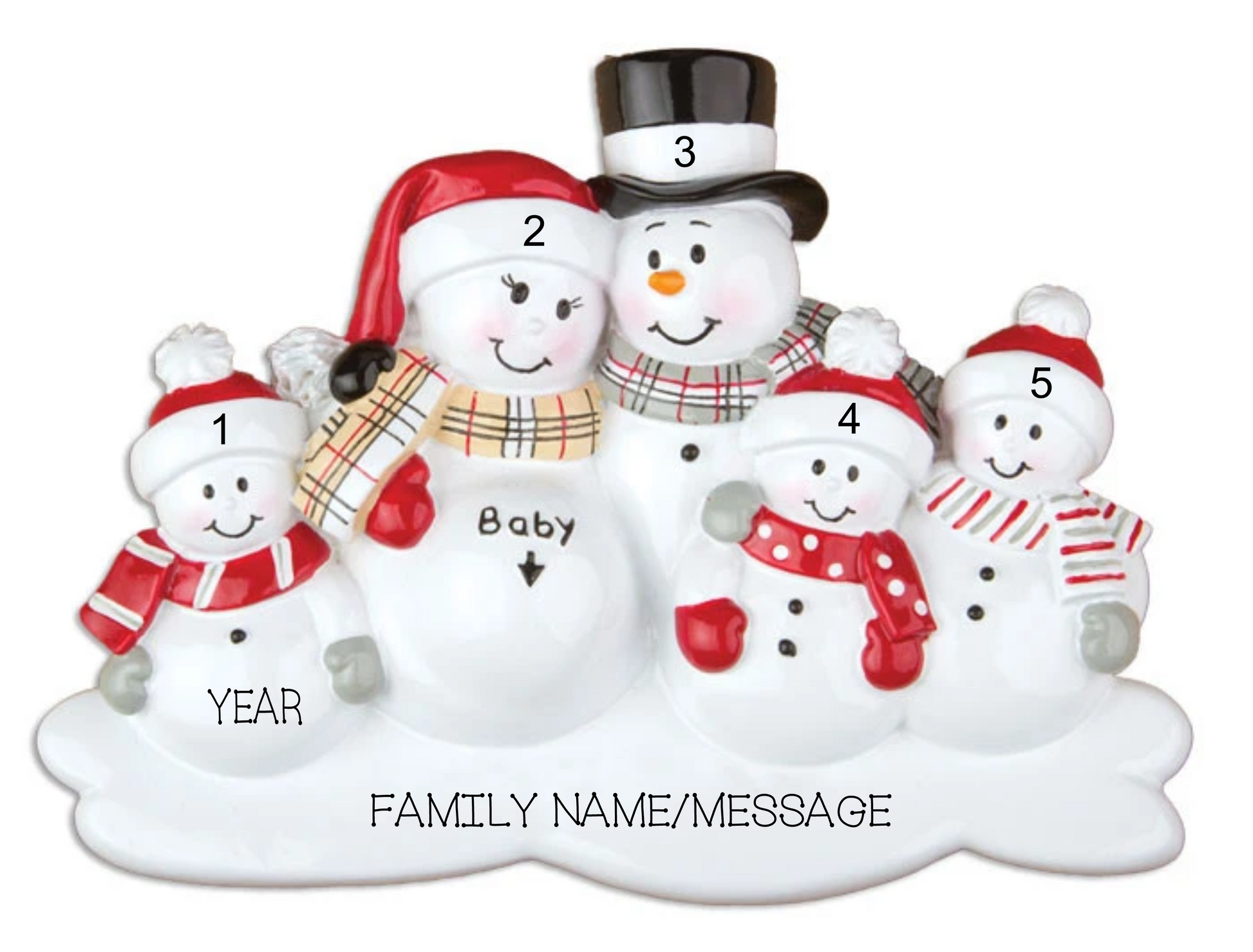 Celebrate the arrival of a growing family with this personalized ornament! Five charming snowmen (one with a cute baby bump) are waiting to be customized with names on their hats and a family name/message on the bottom. And don't forget to add the year for a special touch!