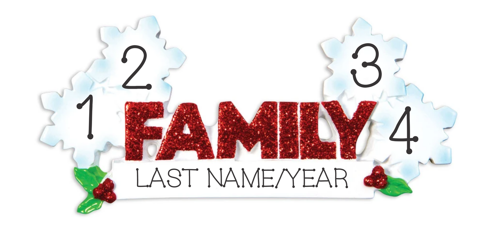 This sparkly ornament is perfect for a family of 4. Include the names and last name and the year.