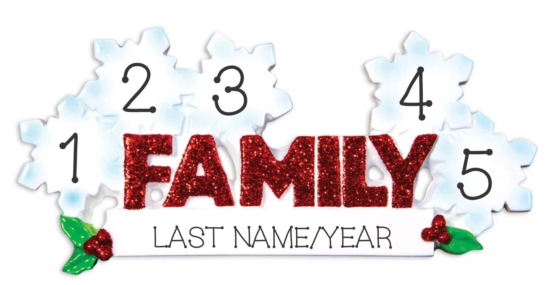 This sparkly ornament is perfect for a family of 5. Include the names and last name and the year.